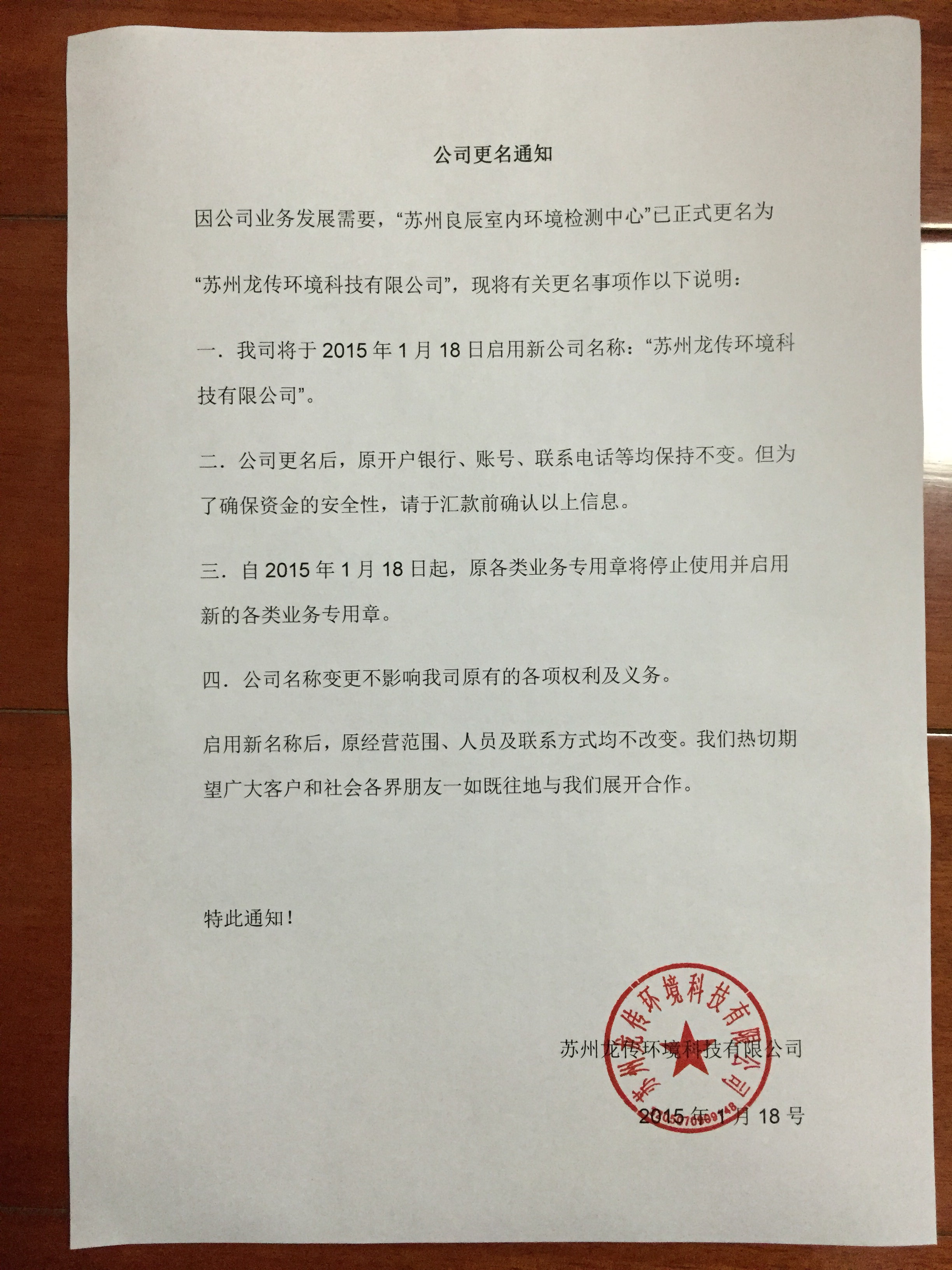 公司更名通知---蘇州龍傳環(huán)境科技有限公司